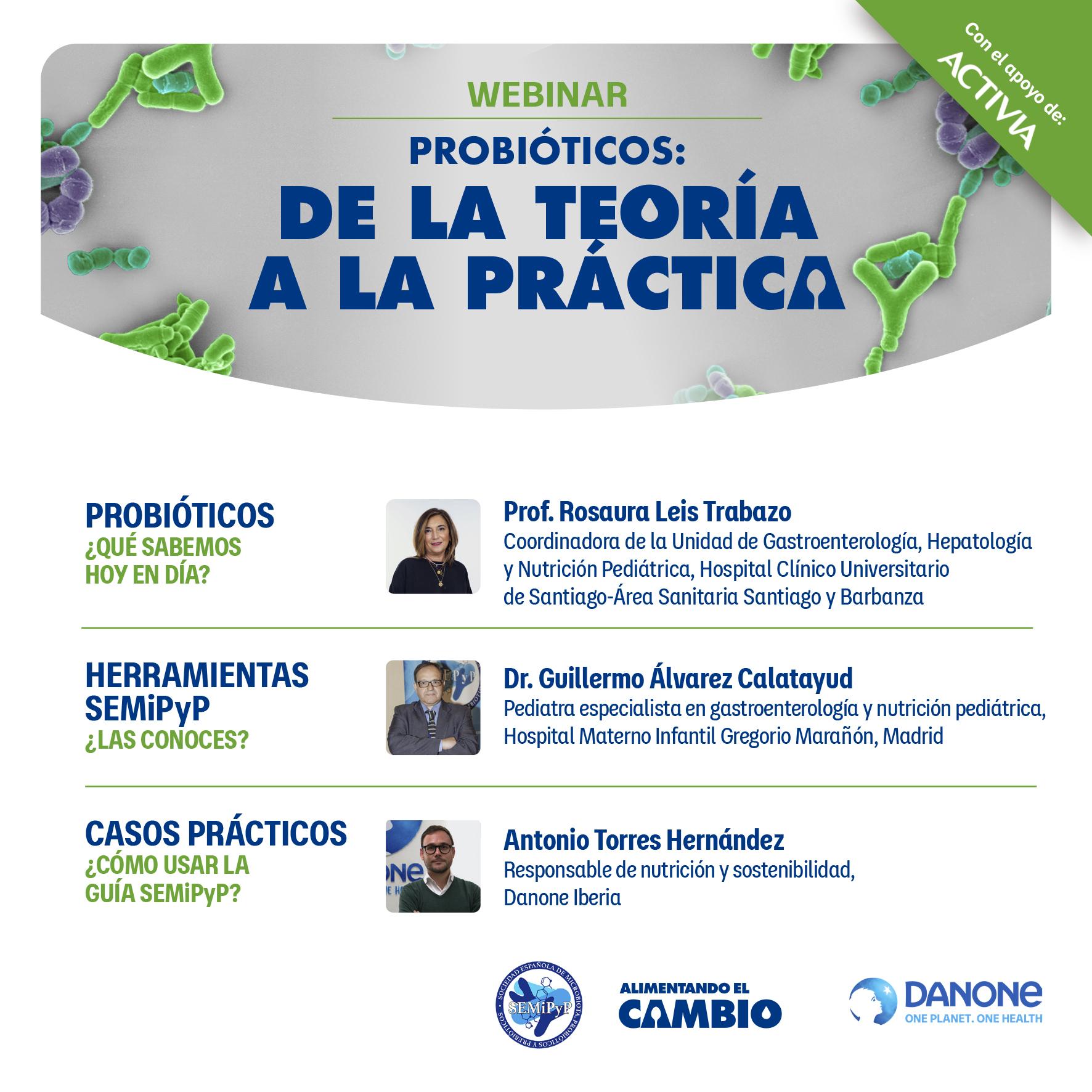 El webinar “Probióticos: de la teoría a la práctica” , apoyado por Activia® y organizado por la Sociedad Española de Microbiota, Probióticos y Prebióticos (SEMiPyP) con la participación de la Prof. Rosaura Leis Trabazo, presidenta de la SEMiPyP y del Dr. Guillermo Álvarez Calatayud, expresidente de la Sociedad. En la sesión se abordaron los beneficios de los probióticos, las últimas investigaciones en el campo y se presentó la nueva Guía de probióticos de la SEMiPyP, una herramienta práctica para profesionales sanitarios.